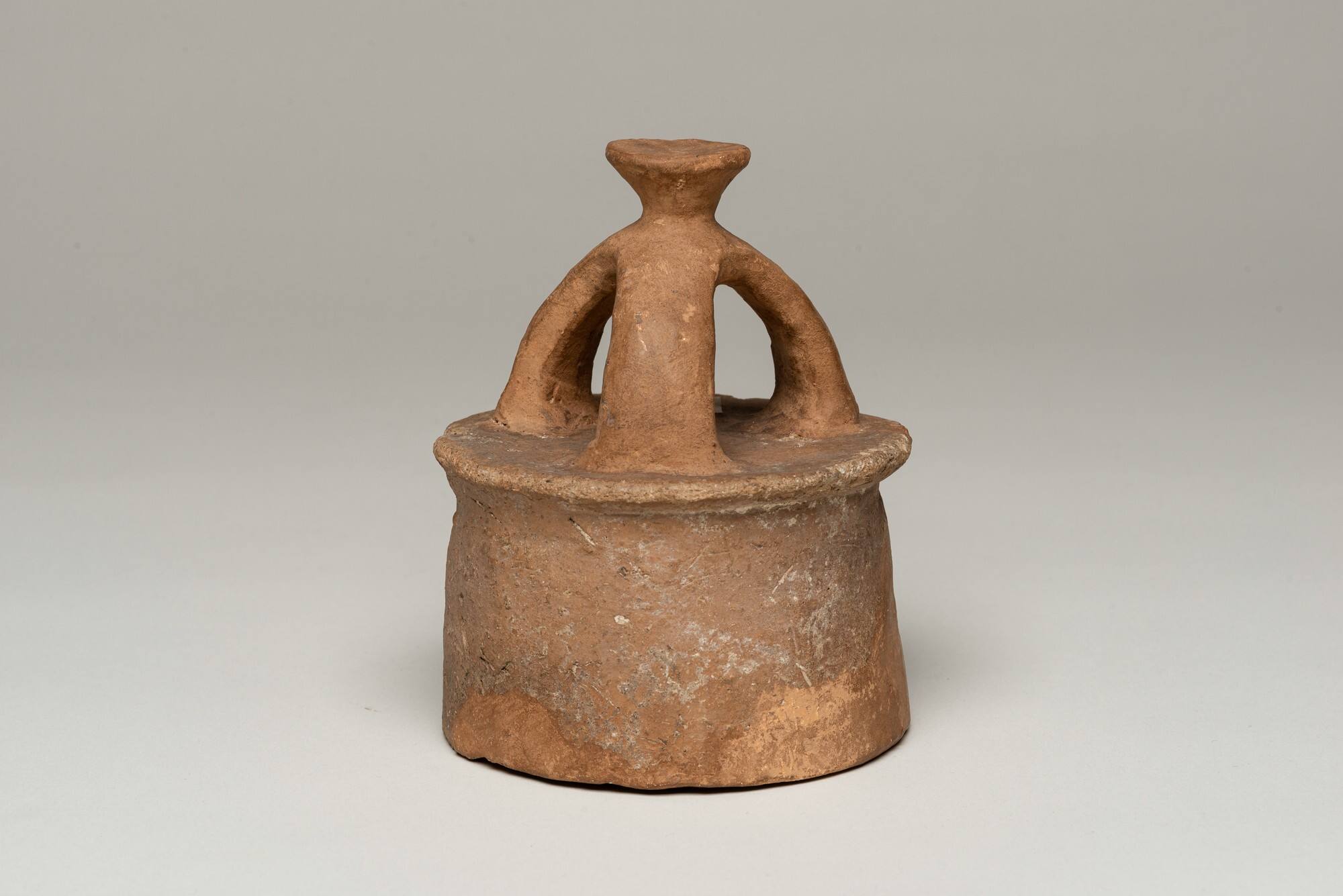 DescriptionDieser Kronendeckel, oft auch als Stülp- oder Urnendeckel bezeichnet, stammt aus den ersten Troia-Grabungen Heinrich Schliemanns. Die genaue Lokalisation innerhalb der Siedlung ist infolge der damals lückenhaften Dokumentation nicht mehr möglich. Schliemann zeigte solche Deckel in einer Publikation von 1881 als Abdeckung für kugelförmige Gefäße mit flügelartigen Applikationen und schrieb sie Troia II zu, das er für das Troia Homers hielt.Der Deckel besteht aus mineralisch gemagertem Ton, ist handgeformt und verfügt über eine rötlich beige Oberfläche, die geglättet wurde. Der Henkelaufsatz verfügt über drei bandförmige Bügel und einen knopfartigen Abschluss, der analog zu anderen Exemplaren dieses Typs restauriert wurde. Vergleichbare oder ähnlich Kronendeckel lassen sich in Troia II bis Troia V finden, mit einem Schwerpunkt auf den beiden früheren Perioden.