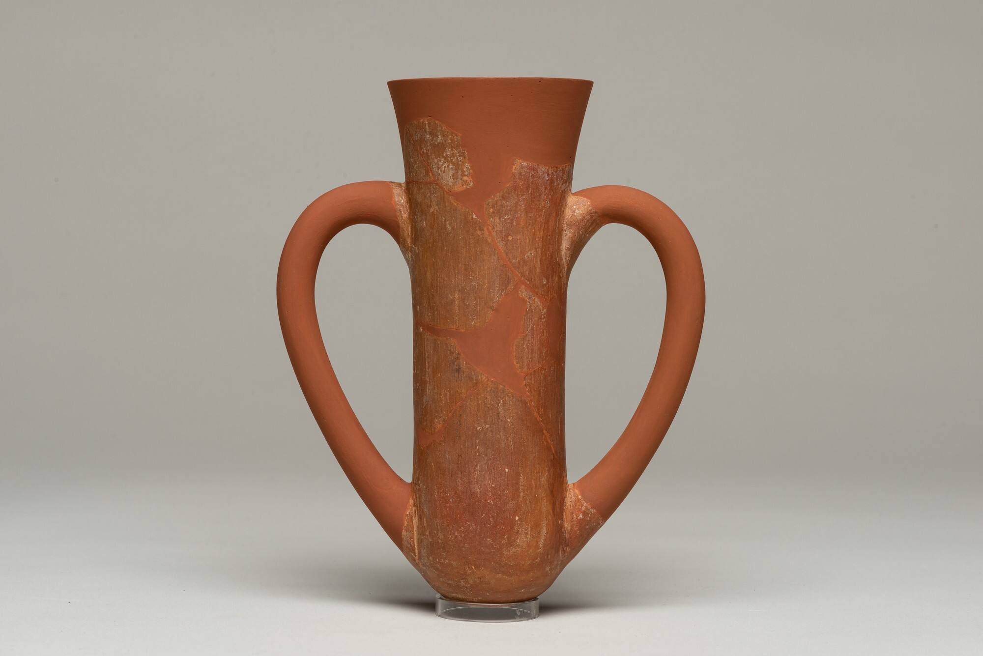 DescriptionDas sogenannte Depas Amphikýpellon (altgr. δέπας ἀμφικύπελλον) ist eine der markantesten Gefäßformen Troias während des 3. Jahrtausends v. Chr. und wird mit der Sitte, in größerer Gesellschaft Wein zu trinken in Verbindung gebracht. Durch die kleine, schräge Standfläche war es quasi unmöglich, das befüllte Gefäß abzustellen, konnte jedoch an den Henkeln bequem von Gast zu Gast weitergereicht werden. Der Name leitet sich von einer Textstelle im ersten Buch der Ilias ab, in der Homer beschreibt, wie Hephaistos mit einem „Depas Amphikýpellon“ genannten Gefäß Nektartrunk schöpft und seiner Mutter Hera und den anderen Olympischen Göttern überreicht, um sie ihm gewogen zu stimmen. In den schmalen hohen Bechern der Frühbronzezeit meinte Heinrich Schliemann ebendiese Form zu erkennen und betrachtete sie als Beweis für die Existenz des Homerischen Troia.Der schmale hohe Depasbecher in der Tübinger Sammlung wurde zwischen 2550–2200 v. Chr. (Troia II–III) zunächst in Wulsttechnik geformt und dann auf der Töpferscheibe nachgedreht, worauf markante Spuren des Arbeitsprozesses im Innern hindeuten. Die Oberfläche erhielt einen deckenden Überzug, wurde streifig poliert und ist der sogenannten „Red-coated ware“ zuzuordnen, die als typisch für die troianische Frühbronzezeit zu betrachten ist. Zu beiden Seiten des Gefäßes befinden sich weit ausschwingende Henkel, die vom Boden bis kurz unter den Rand reichen. Sowohl die Henkel als auch die Randpartie wurden rekonstruiert, auch sind von der Wandung des Bechers nur Fragmente erhalten; die modernen Ergänzungen sind anhand ihrer dunkelroten Färbung zu erkennen.