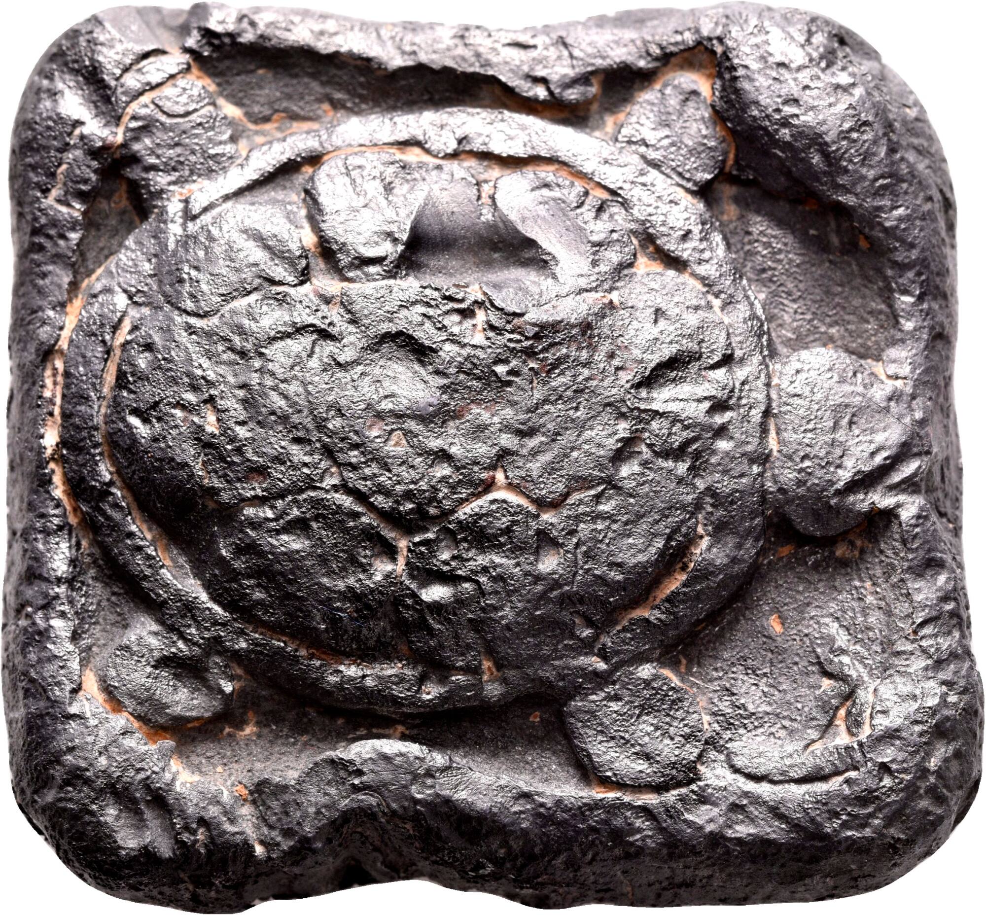 DescriptionDem Gewicht und dem häufiger bezeugten Schildkrötensymbol nach handelt es sich um einen Viertelstater des jüngeren, spätklassischen Gewichtssystems Athens ("regular system" nach M. Lang). Der Stater war die geläufigste attische Gewichtseinheit und entsprach zwei Minen - ist aber von der gleichnamigen Münze (die zwei Drachmen entsprach) zu unterscheiden.DimensionsGew. 228,050 g B 4,5 cm, L 4,85 cm, D 1,5 cm