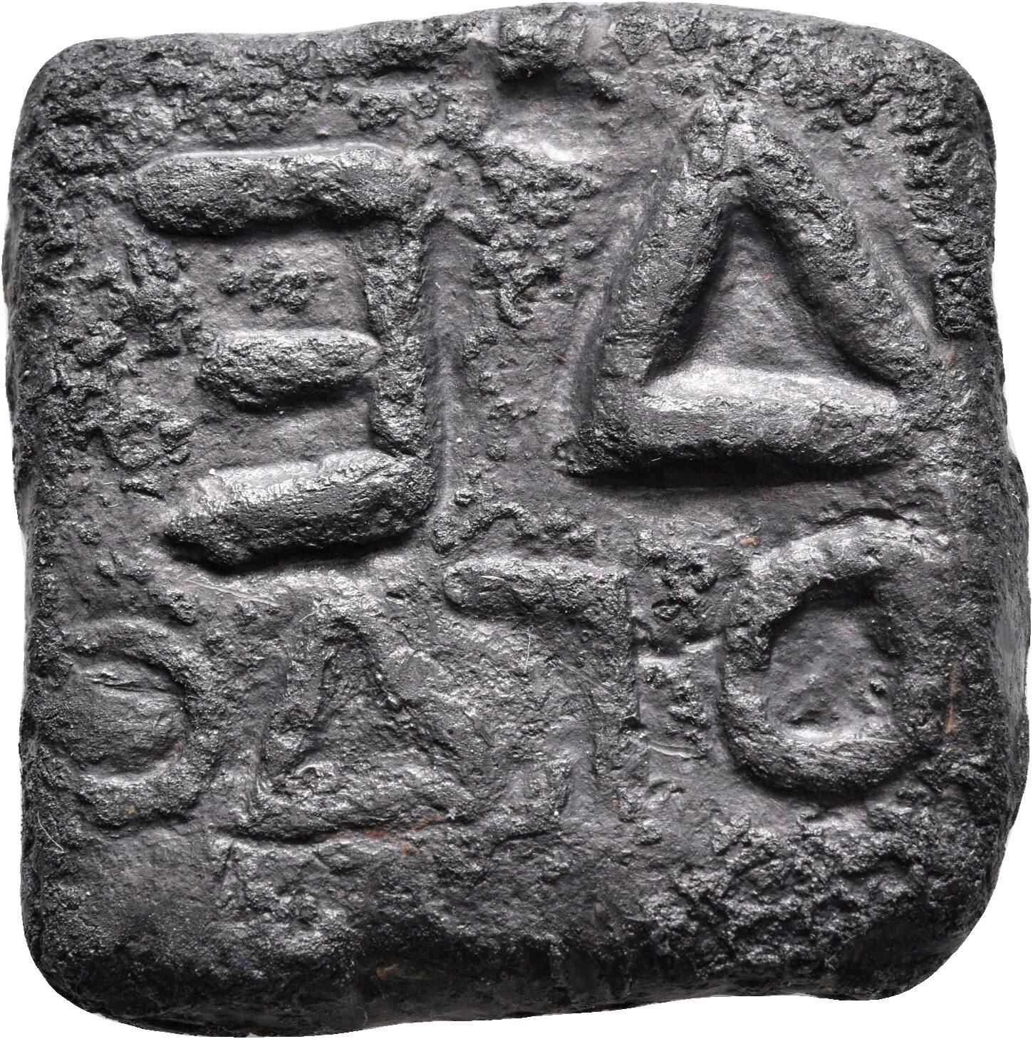 DescriptionLinksläufig sind auf dem Gewicht die Zeichenfolgen ΔE und OΓΔO zu lesen. Ersteres steht für 'demosion', d.h. "dem Volk gehörig, öffentlich" und markiert das Objekt als offizielles Gewicht. 'ogdo', markiert die Einheit als Achter-, wahrscheinlicher als Achtelstück. Das Gewicht von 53,76g erlaubt nicht, hier einen Achtelstater zu erkennen, es dürfte sich am ehesten um eine Achtelmine handeln, auch wenn die Abweichung von 11% relativ hoch ist.DimensionsGew. 53,76 g B 3,1 cm, H 3,1 cm, D 0,85 cm