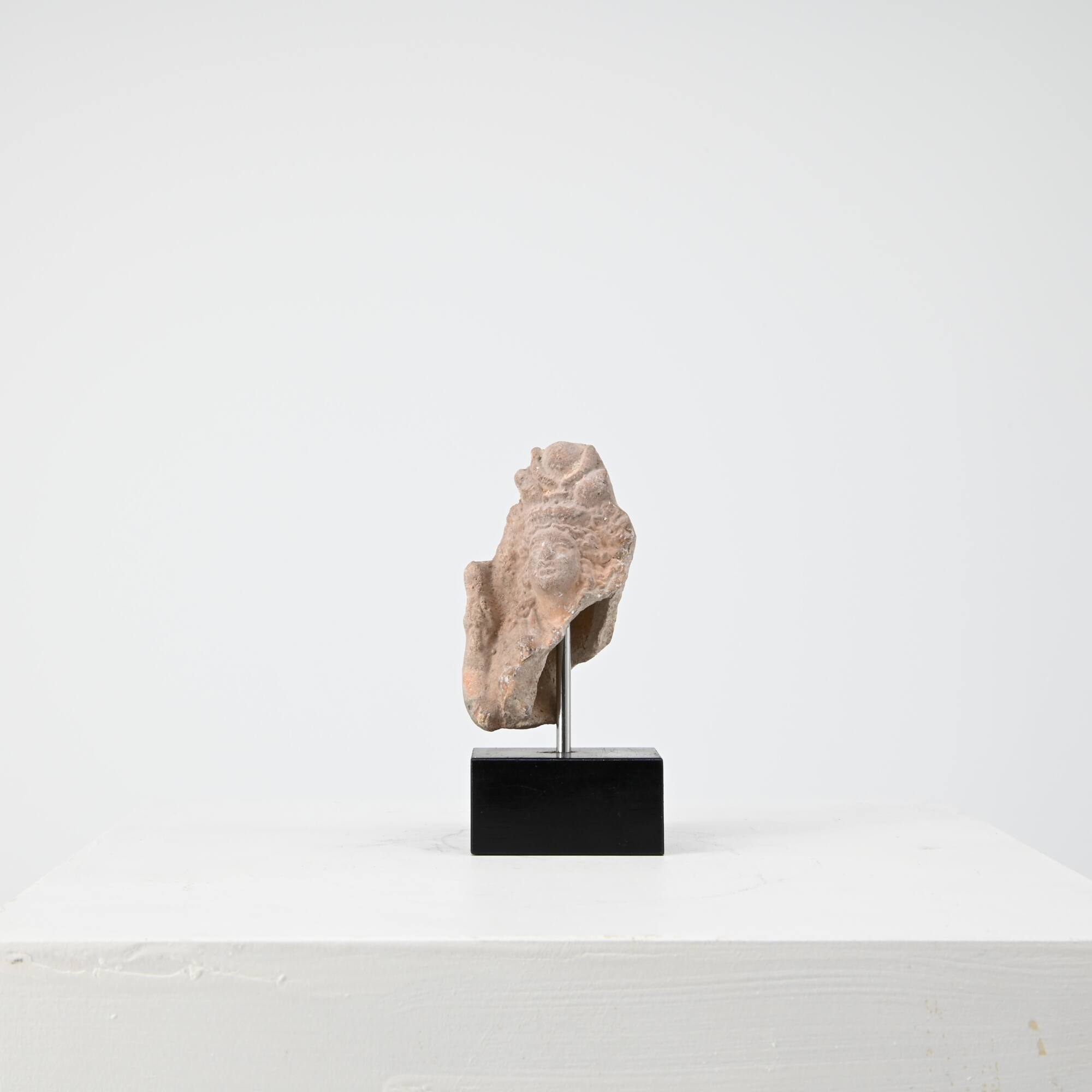 DescriptionOberkörperfragment einer Isis-Bubastis wie oben Nr. 863. Noch erhalten ist die rechte Brustseite mit ausgefranstem Mantel sowie der mit dem Sistrum erhobene Arm. Das Gesicht ist voll-oval, die mandelförmigen Augen haben nur schmale Sehschlitze. Die herzförmige Oberlippe und die nahezu geradlinige Unterlippe berühren sich in den Winkeln nicht. Zur Seite gestrichene wellige Haare fallen seitlich in Korkenzieherlocken herab. Ein schmaler Kranz sitzt waagrecht über der Stirn, ein weitaus üppigeres Gebinde umrahmt den Kopf wie ein großer Nimbus. Zwei massige Lotosknospen, Kuhgehörn und Sonnenscheibe bilden die Krone.DimensionsH 5,9 cm; B 5,8 cm; T 2,8 cm