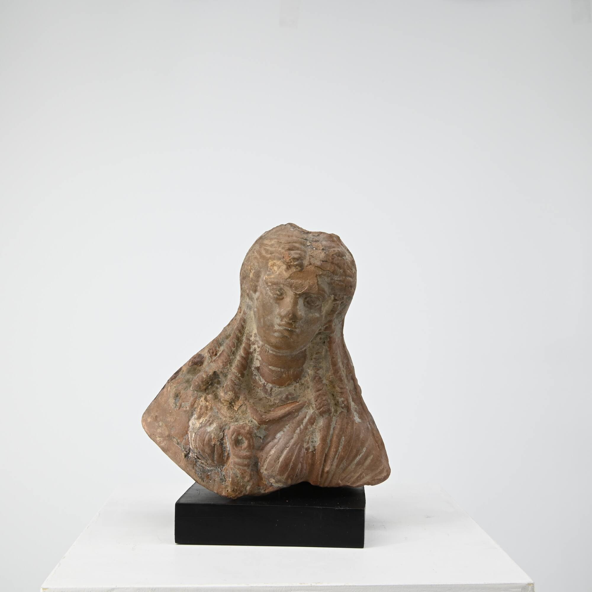 DescriptionSeitlich abgerundete, große Büste der Göttin Isis, die unterhalb der Brüste endet. Sie trägt einen in breite Falten gelegten Chiton, der am Hals v-förmig absteht. Der zwischen den Brüsten verknotete Mantel, dessen Fransensaum an der rechten Schulter zu sehen ist, bedeckt den linken Oberarm in massiven parallelen Staufalten. Isis üppiger Kopf ist leicht zur linken Seite geneigt, die stark umrandeten Augen sind weit geöffnet. Langes, leicht gelocktes Haar ist über der Stirn gescheitelt und zur Seite gestrichen, im Nacken ist es zum Knoten zusammengefasst, auf die Schultern fällt es in Korkenzieherlocken hinab. Vermutlich schmückte eine Krone den Kopf.DimensionsH 13,3 cm; B 12,7 cm; T 6,2 cm