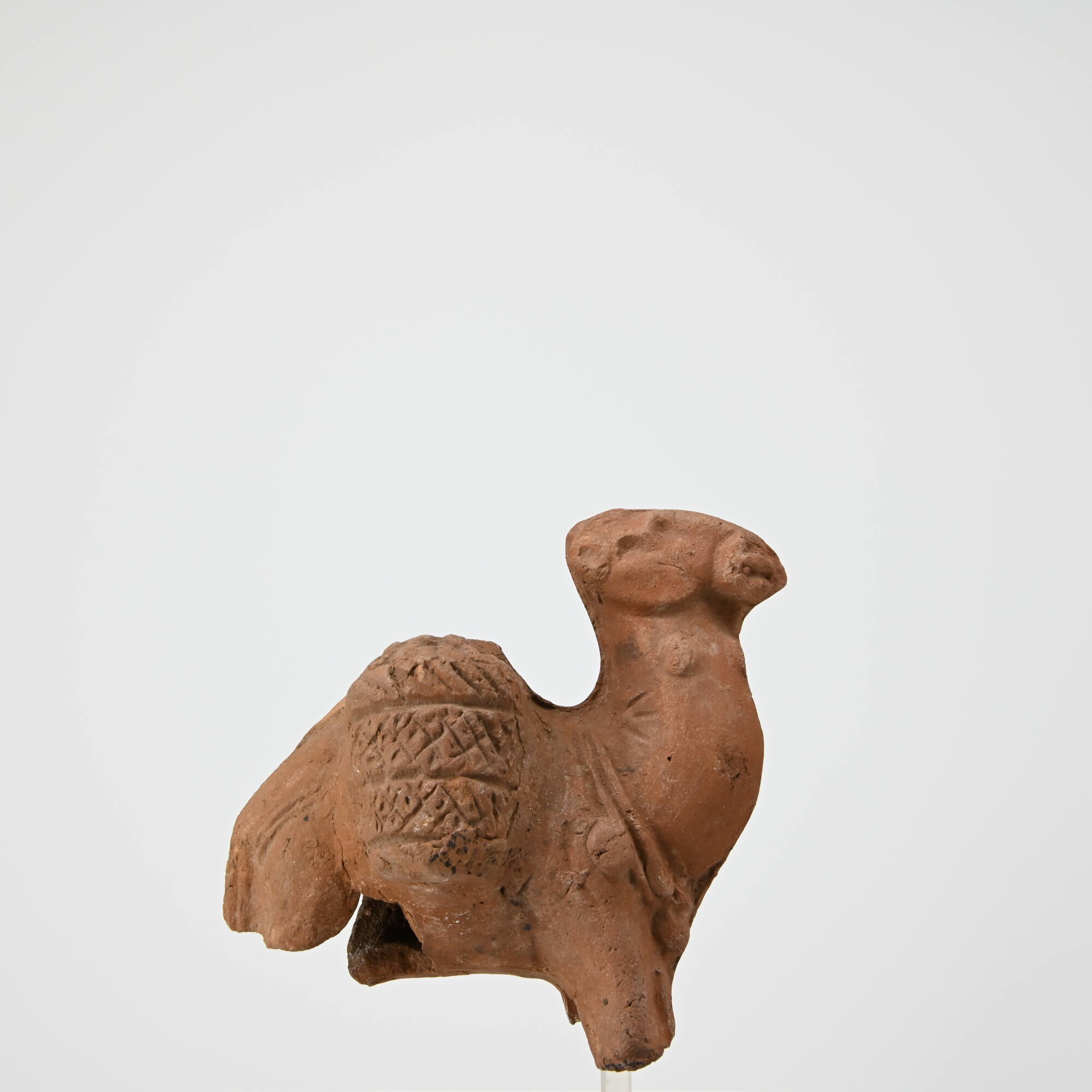 DescriptionFragment eines Kamels, das zwei Körbe auf dem Rücken trägt, deren Struktur mit Ritzmuster angegeben ist. Um den Hals des Tieres hängt ein Band mit Amuletten.DimensionsH 9,5 cm; B 9,5 cm; T 6,5 cm