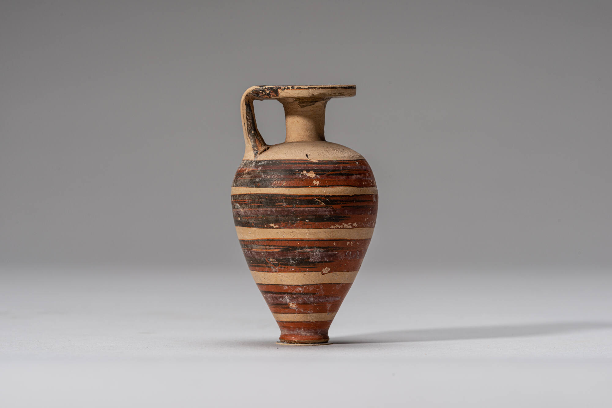 DescriptionFünf breite Firnisringe. Auf dem Mündungsteller zwei konzentrische Ringe. Oberster Firnisring mit zwei feinen roten Streifen, alle übrigen an Körper und Mündungsteller mit einem roten Streifen. Kanten des Henkels und Ansatz des Mündungstellers gefirnißt.DimensionsH 8,9 cm