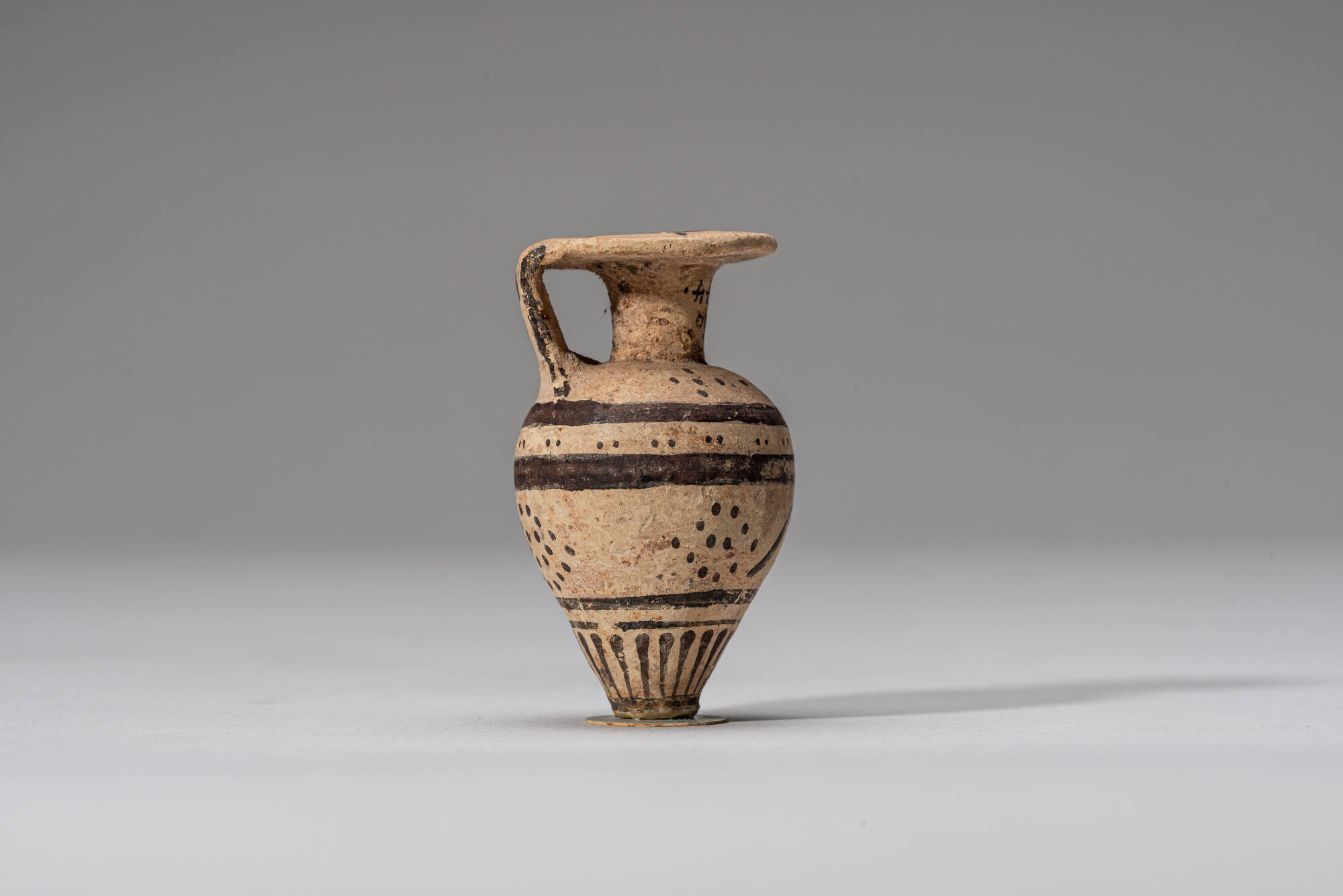 DescriptionBildzone zwischen schmalem Streifen unten und doppelter Punktreihe zwischen breiteren Streifen oben: Flüchtig gezeichneter Hund nach links zwischen Punktrauten. Am Fuß Zungenmuster zwischen Streifen. Auf der Schulter Punktrosetten. Henkelkanten gefirnißt. Auf dem Mündungsteller Strahlenkranz, ausgehend von einem Ring um die Mündungsöffnung.DimensionsH 6,6 cm