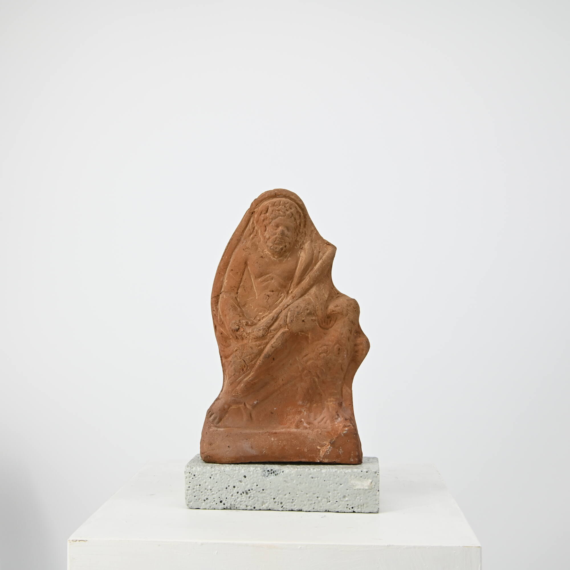 DescriptionAdler mit ausgebreiteten Schwingen im Profil, den Kopf nach hinten gewandt, auf glatter Basis. Auf seinem Rücken sitzt der Göttervater Zeus mit gekreuzten Beinen, den Oberkörper frontal ausgerichtet, den Unterkörper nach rechts gedreht. Er ist in einen Mantel gehüllt, der um den Kopf geschlungen ist und von der linkenSchulter über den Arm herabfällt. Rechte Schulter und Brust sind unbedeckt, die Rippenbögen sind schlampig eingeritzt. Mit der gesenkten rechten Hand hält er ein stabartiges Szepter, das in der linken Armbeuge ruht. Sein zur linken Seite gewandter Kopf ist bärtig und von wirren Locken umgeben, ein Kranz oder Diadem schmückt ihn. Qualitätlose unplastische Arbeit. Einziger in Ägypten vorkommender Zeustyp, von Darstellungen der Kaiserapotheose abhängig. Erst ab dem 2. Jh. n. Chr. belegt, auch auf Münzen seit trajanischer Zeit.