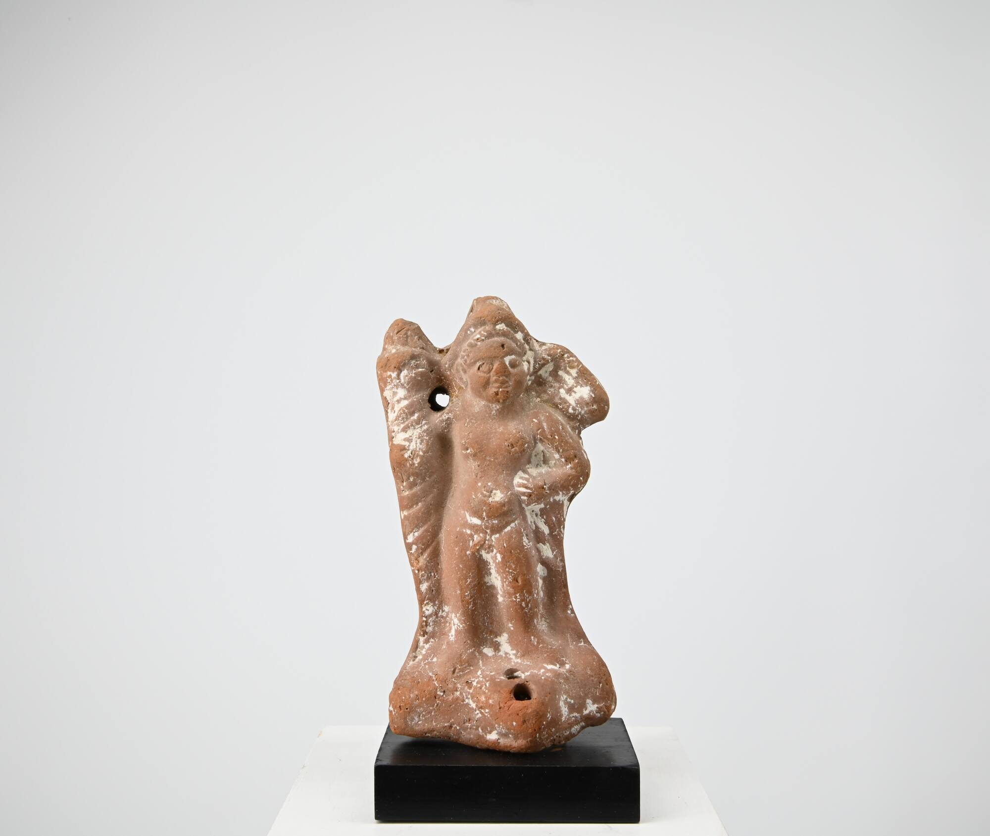 DescriptionAuf Basis mit Froschlampenschnauze steht der nackte Eros, den linken Arm in die Hüfte gestemmt, rechts eine mannshohe Fackel im Arm. Ein kleiner hochsitzender Flügel ist über der linken Schulter ausgebreitet. Der Körper des Knaben ist vollkommen unstrukturiert, der Kopf ohne Hals und verhältnismäßig groß. Das breite Gesicht mit großen Augen und dicken, parallelen Lippen ist von schraffierten zurückgestrichenen Haaren umgeben, auf denen eine spitze Mütze mit hochgezogenem Rand sitzt.DimensionsH 15,8 cm; B 8,1 cm; T 5,2 cm