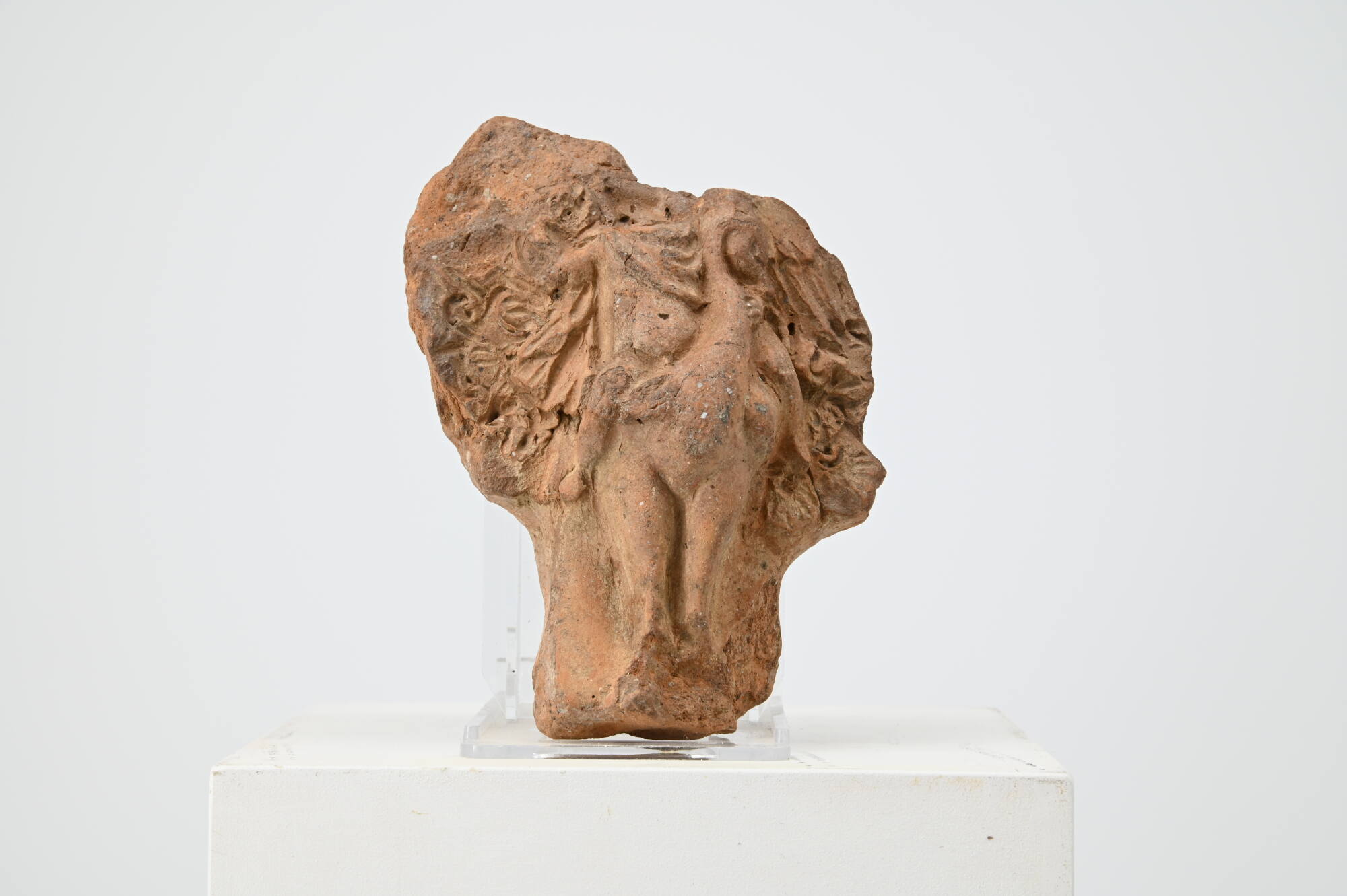 DescriptionFrontal ausgerichteter Pfau mit stemmigen Schenkeln und ausgebreitetem Gefieder, den Kopf nach rechts gewandt. Auf seinem Rücken sitzt mit angezogenen Beinen ein kleiner dickbäuchiger Eros, an dessen rechter Schulter ein Mäntelchen verschlossen ist, das vorne schräg vor die Brust hängt und im Rücken in mehreren stark gebauschten Gewandzipfeln flattert. Der rechte Arm war erhoben, die linke Hand greift um den Tierhals. Die langen Federn des ausgebreiteten Flügels sind links sichtbar. Vermutlich fehlerhafte Ausformung, da Kopf des Pfaus, sowie die seitlich in die Fläche gearbeiteten Flügel und das Gewand nachgeschnitten sind.