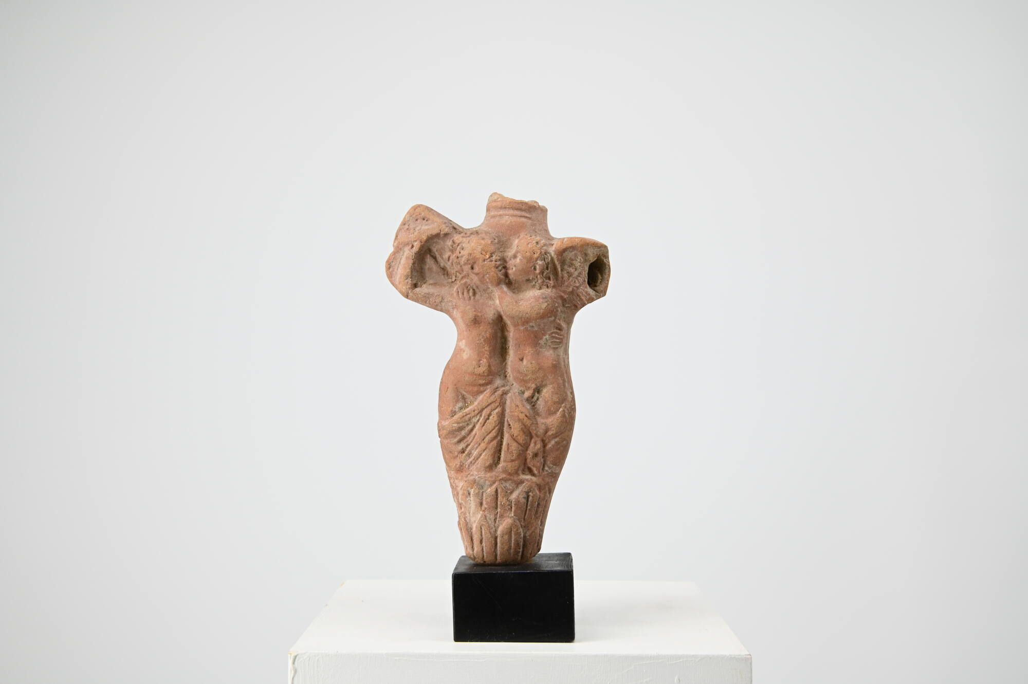DescriptionFlasche mit Fuß in Form eines Lotosblätterkapitells, aus dem Eros und Psyche ab Kniehöhe aufragen. Sie stehen frontal ausgerichtet mit vorgestelltem inneren Bein dicht aneinander gedrückt. Eros wendet sich seiner Partnerin zu: Während er seinen rechten Arm um Psyches Schultern gelegt hat, greift er mit dem linken an ihre Wange. Sein rundes kindliches Gesicht ist knapp vor ihrem, mit schmachtend aufwärts gerichtetem Blick versucht er, sie zu küssen. Seine langen, wirr gelockten und mit wenig kurzen Strichen angegebenen Haare sind nach hinten gestrichen. Sein kindlicher Körper ist weich, der Bauch wölbt sich rund. Ein Mantel, der in einer Rolle um die Hüften gewickelt und in der Mitte verknotet war, droht von den Oberschenkeln hinabzugleiten. Der Stoff fällt in wenigen, scharf eingeschnittenen Falten. Psyche umfängt ihrerseits mit ihrem linken Arm Eros Rücken, ihre Hand kommt unter seinem Flügel zum Vorschein. Mit ihrer linken Hand zieht sie einen Zipfel ihres bereits über die Hüften hinabgerutschten Gewandes über die Schultern hoch - in der für Venus typischen Geste. Ein großer Schmetterlingsflügel mit rechteckigem Umriß ist hinter ihrem Arm ausgebreitet. Psyches Körper ist jugendlich, schlank und weich, ihre Brüste sind klein. Ihr Kopf ist leider stark beschädigt, vermutlich trug sie eine Melonenfrisur mit Haarschleife.DimensionsH 13,7 cm; B 8,1 cm; T 3,6 cm