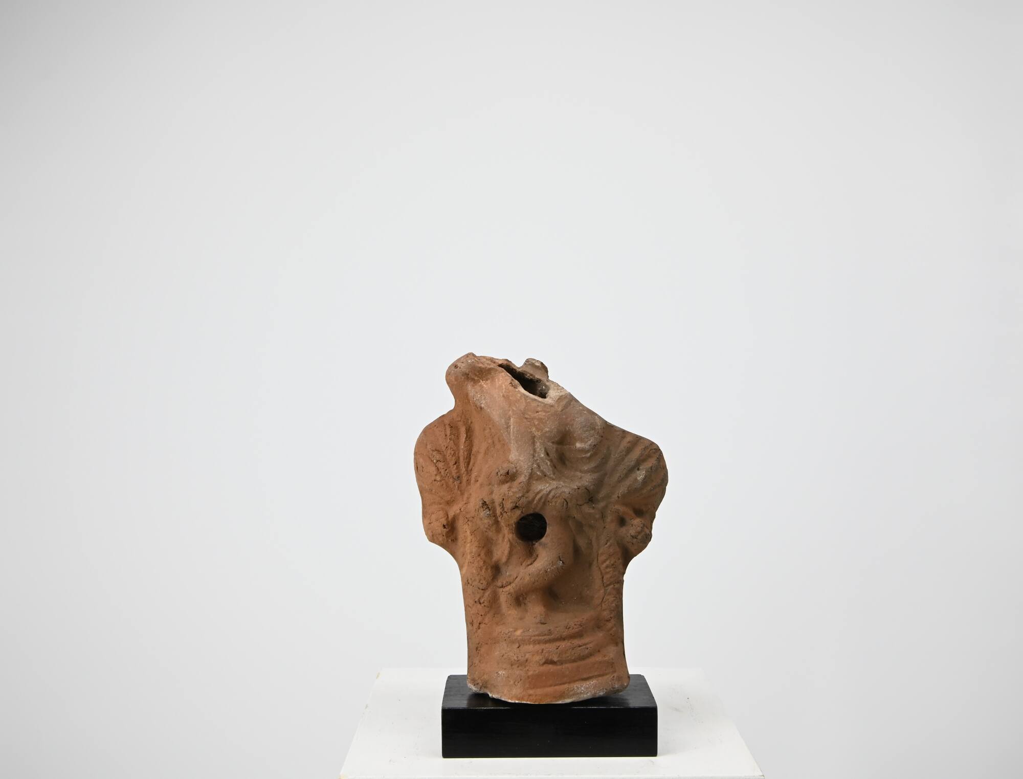 DescriptionAuf einer 2,8 cm hohen Basis aus vier Ringen - die zwei unteren sechseckig, die zwei darüber rund - steht Priapos, das linke Bein über das rechte gekreuzt und nur auf Zehenspitzen ruhend. Er trägt ein üppiges ärmelloses Gewand, das von der linken Schulter hinabgerutscht ist und von der Hand in einer Rolle über den Penis hochgerafft wird. An der rechten Hüfte sind Früchte dargestellt, die in dem geschürzten Kleidungsstück gesammelt sind. Der rechte Arm des Priapos ist zum Kopf erhoben. Beidseitig stehen kleine Palmen auf dem 2. Basisring, die bis in Schulterhöhe reichen. Ungewöhnliche Variante.DimensionsH 13,4 cm; B (Bas) 6,2 cm; T (Bas) 4,9 cm
