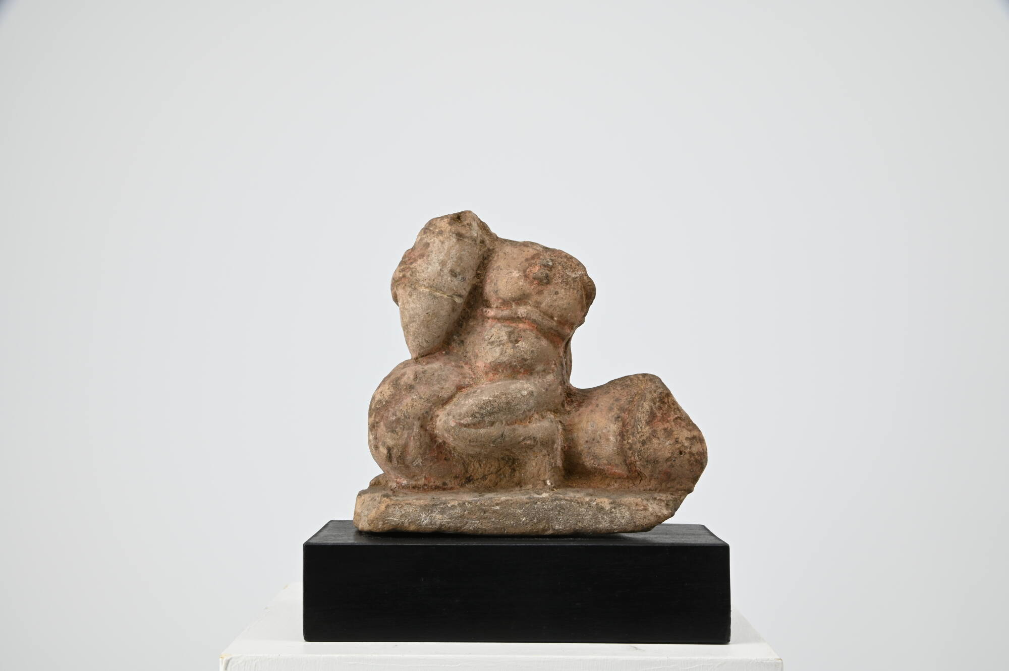 DescriptionEin feister nackter Knabe (der Kopf ist nicht erhalten) sitzt rittlings auf seinem enormen Phallos, der vorne umbiegt und zwischen den Beinen durchführt. Der Oberkörper ist frontal ausgerichtet, unterhalb der markanten Brust sind zwei tiefe Speckfalten gebildet. Seine Beine sind angewinkelt: Während das linke nur mit den Zehenspitzen den Boden berührt, steht das rechte mit ganzer Sohle auf. Im rechten Arm hält die Figur ein eiförmiges Gefäß.DimensionsH 9,6 cm; B 10,1 cm; T 4,9 cm