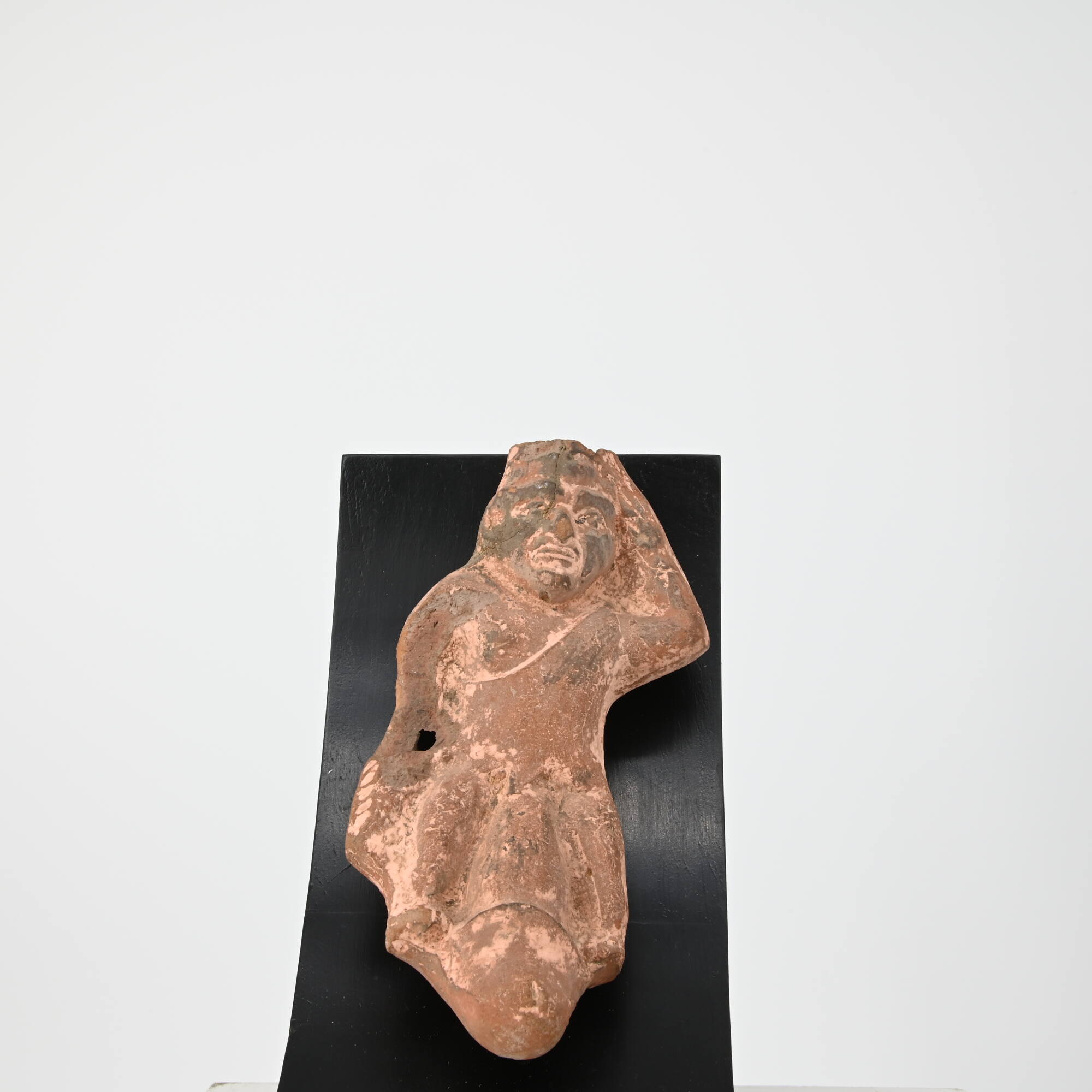 DescriptionKarikatur mit überdimensionalem Phallos in Bootsform. Die Figur hält die linke ausgestreckte Hand ans Ohr, in der herabhängenden rechten hält sie einen unkenntlichen Gegenstand, vermutlich einen Fisch. Zwischen ihren kurzen gespreizten Beinen kommt ein großer Phallos hervor, dessen Spitze aufgebogen ist und quasi den Schiffskiel bildet. Der formlose Körper ist mit einer unten ausgefransten Exomis bekleidet, die an der linken Schulter verknotet ist. Das Gesicht mit Hakennase und groben Zügen hat eine enorm hohe und breite Stirn, die vermutlich von einem Spitzhut bekrönt war.DimensionsH 16,2 cm; B 7,2 cm; T 3,7 cm