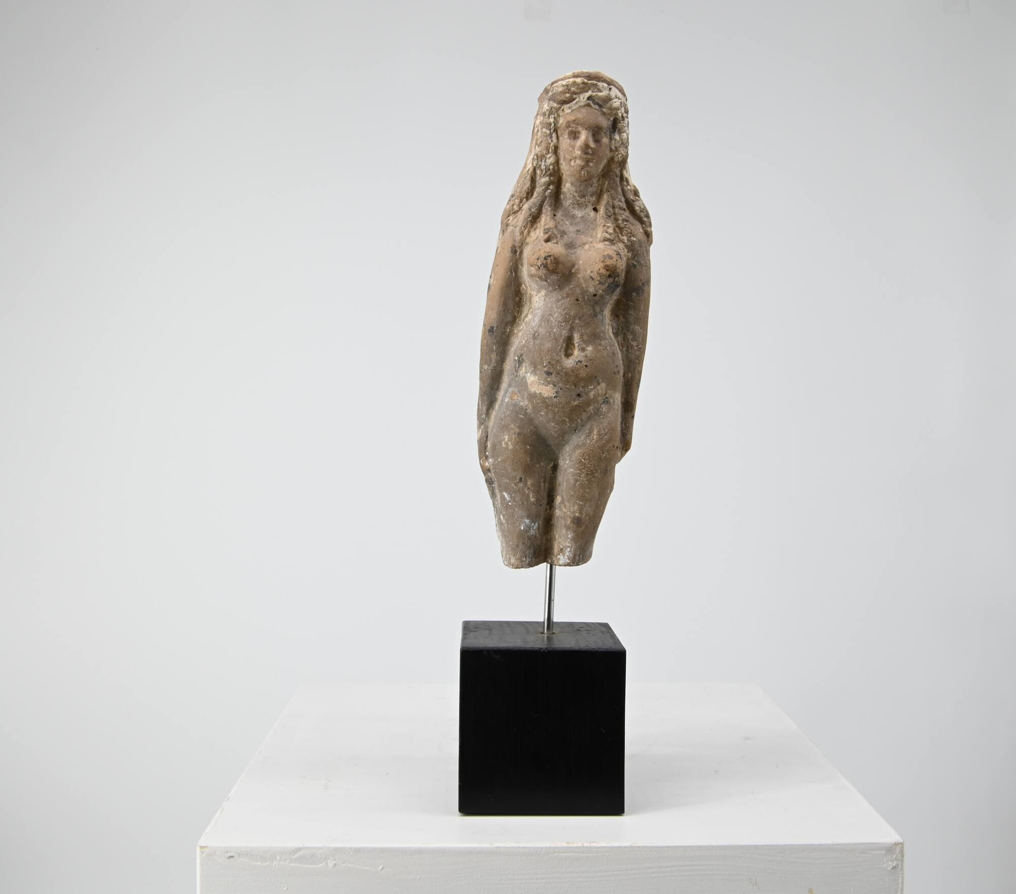 DescriptionStatuette einer nackten Frau mit eng anliegenden Armen und aneinandergepressten Beinen. Der Aufbau des Körpers wirkt streng, das Inkarnat fest: Der Oberkörper mit seitlich herabhängenden Armen bildet ein langgezogenes Rechteck, die Taille ist betont eingezogen. Der Nabel liegt vertieft im weichen Bauch, die Brüste sind kugelig rund. Das schlanke Gesicht hat annähernd dreieckige Form. Die langen üppigen Haare sind über der Stirn gescheitelt, seitlich fallen sie in Korkenzieherlocken auf die Schultern. Eine einfache schmale Binde ziert das schöne Köpfchen. Früher Vertreter eines häufig vorkommenden, im Kopfputz stark variierenden Typus, früher analog zu altägyptischen Statuetten als Totenbraut bezeichnet. Deutung letztlich unklar, aber vermutlich auf 'Nackte Göttinnen' zurückgehend, die ihrerseits mit der orientalischen Ischtar zusammenhängen.DimensionsH 15,3 cm; B 5,1 cm; T 3,5 cm