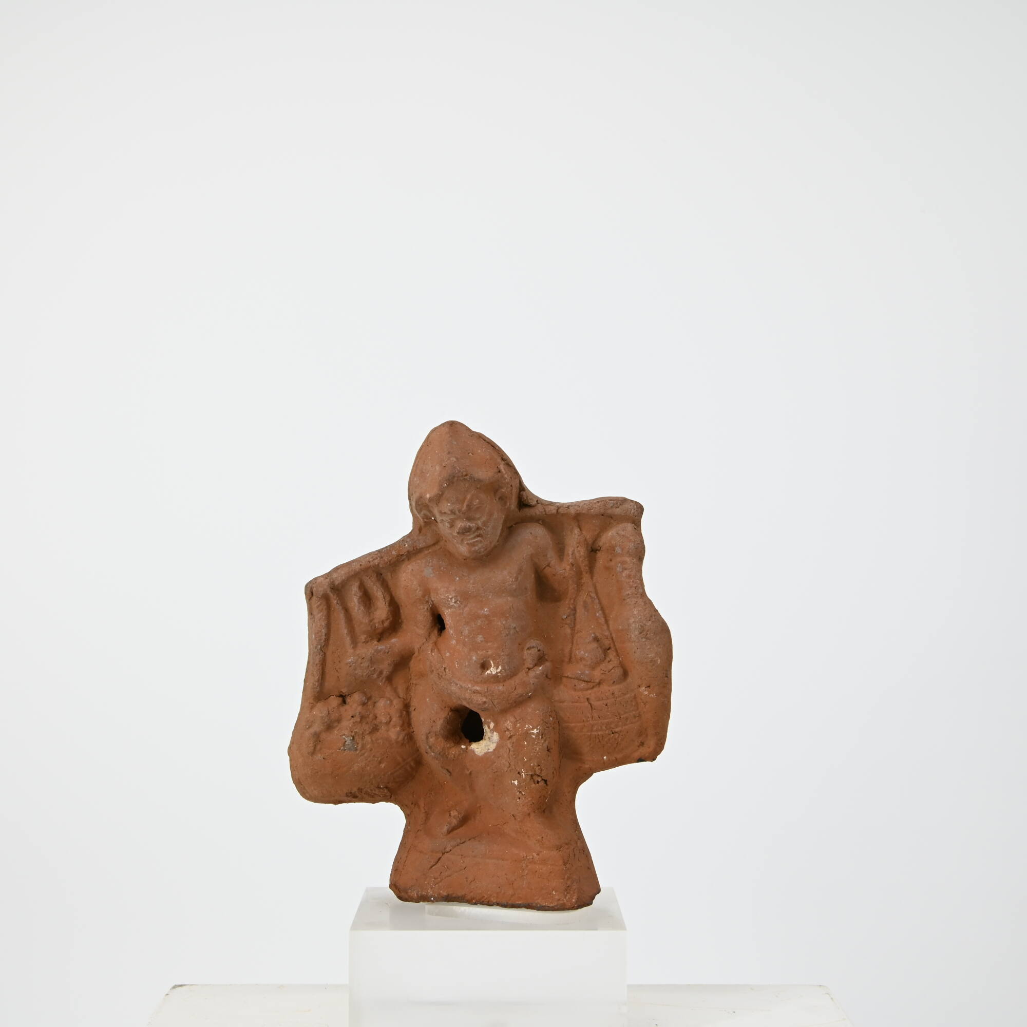 DescriptionAuf annähernd 5-eckiger, 1,6 cm hoher Basis Figur eines zwergenhaften Dieners mit vorgesetztem linken Bein, eine breite Tragestange auf den Schultern. Mit der erhobenen linken Hand umfängt er die schwer lastende Stange, mit der rechten fasst er in die Schnüre eines daran hängenden, üppig gefüllten Korbes. Daneben baumelt an der Stange eine kleine Handgirlande. An der anderen Stangenseite hängt ebenfalls ein Korb sowie eine schmale Spitzamphore. Der Sklave ist nur mit einem schmal zusammengerollten Hüfttuch bekleidet, unter dem der große Einsatzpenis zum Vorschein kam. Auf dem Kopf trägt er eine spitze Mütze mit wellenförmiger Struktur. Sein Körper ist gedrungen, die Beine sind kurz und o-förmig. Der ebenfalls gedrungene und breite Schädel gibt typisch pygmäenhafte Züge wieder: stark kontrahierte, wulstige Brauen, die beinahe senkrecht die Stirn durchziehen, eine kurze, stark eingedellte Nase, ein unauffälliger Mund und schweres eckiges Kinn.DimensionsH 13,4 cm; B 6,4 cm; T 4,3 cm