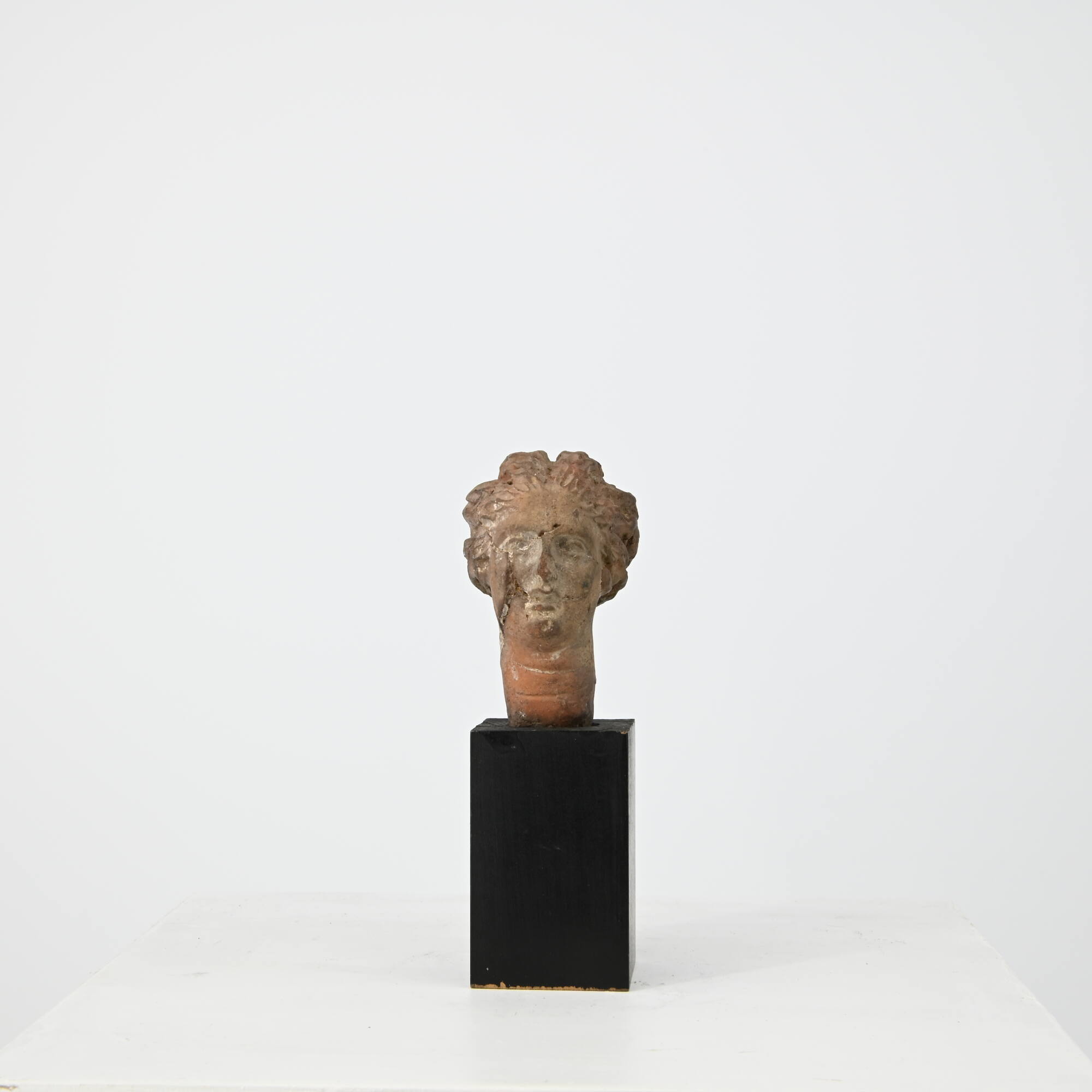 DescriptionEinsatzkopf mit kräftig ovalem Gesicht und bauschiger Melonenfrisur. Auf RS ein tiefsitzender kreisförmiger Dutt. Rundes Kinn, leicht geöffneter herzförmiger Mund, insgesamt schwere Formen. Die unregelmäßige Oberfläche der Haare ist mit linsenförmigen Einschnitten gegliedert. Rechts ein ringförmiger Ohrring.DimensionsH 6,7 cm; B 3,9 cm; T 5,4 cm