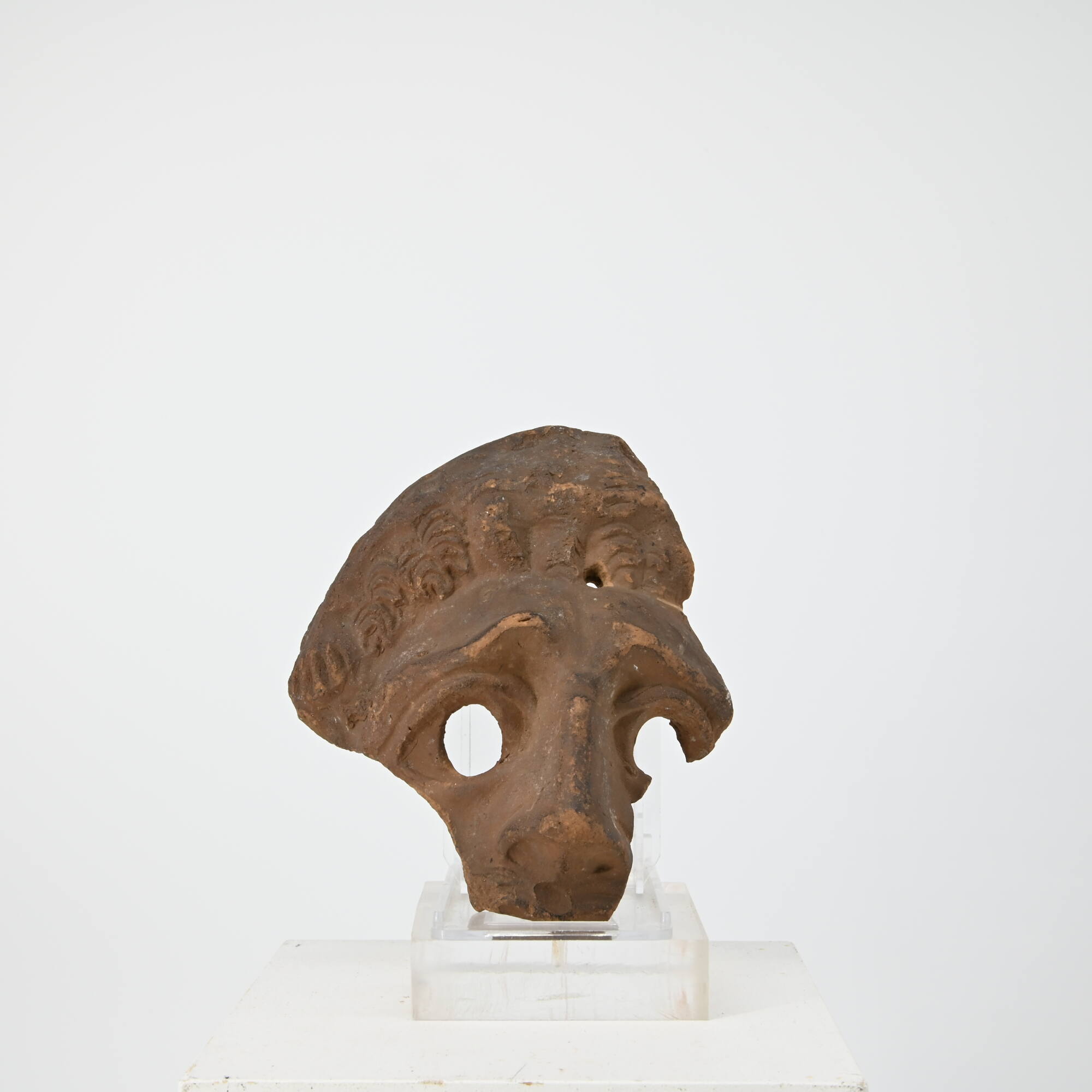 DescriptionFragment einer weiblichen Maske mit geöffnetem Mund und großen, durchstoßenen Pupillen. Die Stirn mit wulstigen Brauen wird von mehreren Reihen von Buckellocken eingerahmt.DimensionsH 14,2 cm; B 12,6 cm