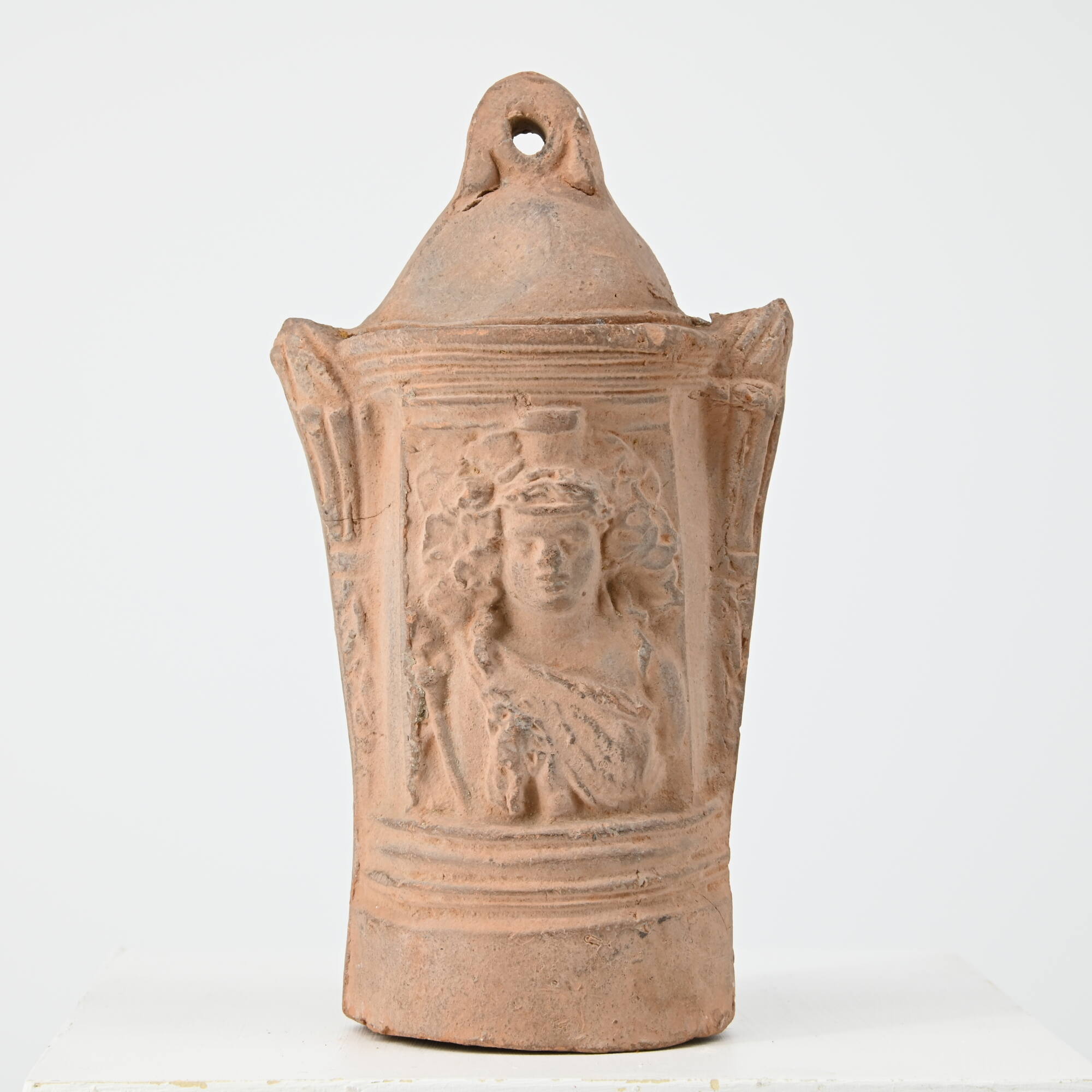 DescriptionLichthäuschen in Form eines Monopteros auf hoher, oben mehrfach profilierter Basis, der seitlich von jeweils einer Fackel bis in Höhe des Architravs umgeben ist. Ein hochgewölbtes unverziertes Dach endet in einer Henkelöse. Zwischen Basis und dem mehrfach profilierten, räumlich wiedergegebenen Architrav ergibt sich ein von Pilastern flankiertes Bildfeld, das mit der Büste eines Dionysos ausgefüllt ist. Der Gott ist mit einem Leopardenfell bekleidet, das seine linke Schulter freiläßt, rechts hält er einen Thyrsosstab. Sein langes, über der Stirn gescheiteltes Haar wird von einer schmalen Binde zusammengehalten; ein mächtiger Kopfputz aus Blä ttern und Korymben fällt bis auf die Schultern hinab. Auf der Rückseite befindet sich eine türähnliche, oben gebogene Öffnung, die von Pilastern in zartem Relief gerahmt ist.DimensionsH 14,5; B 5,9; T 4,8