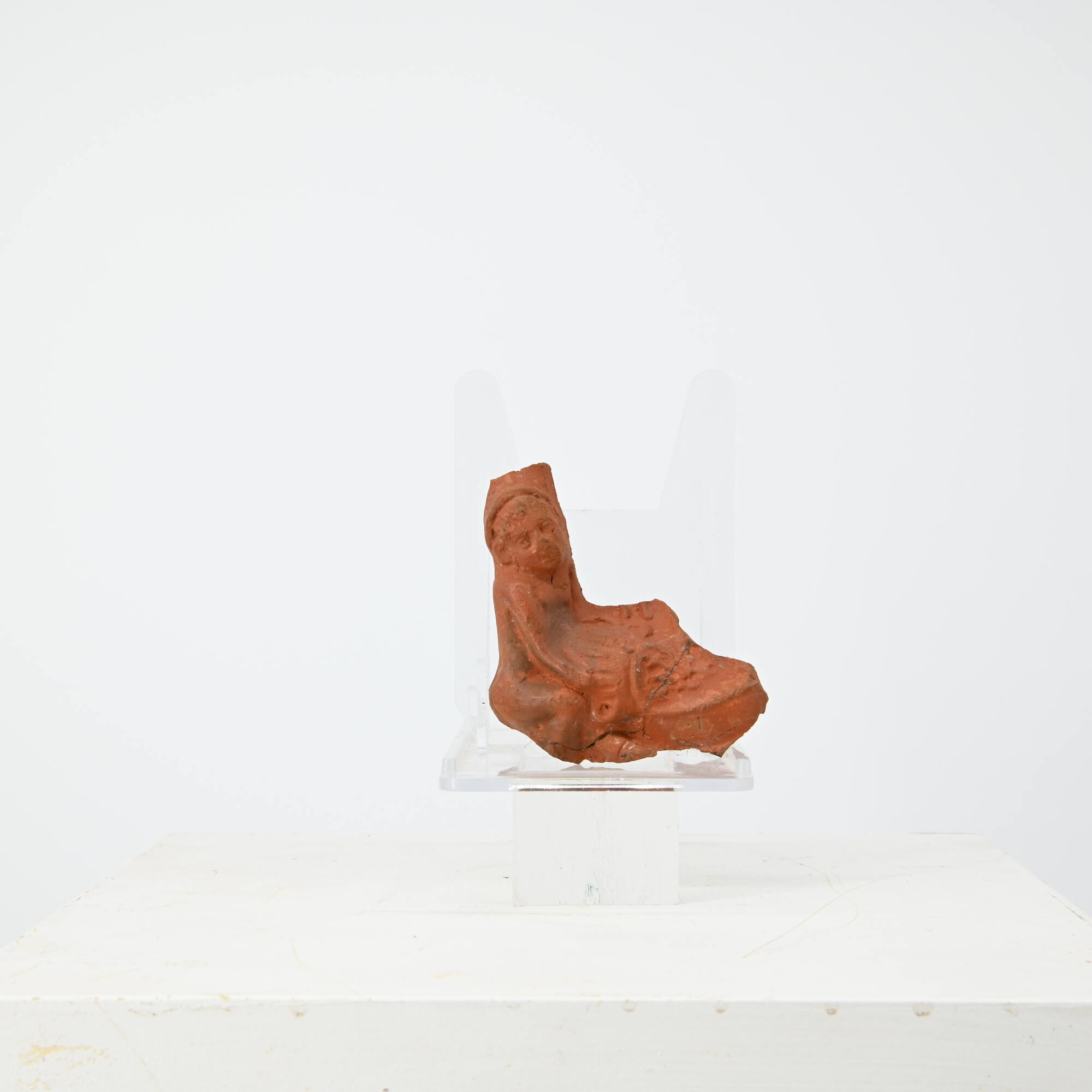DescriptionFragment einer mehrfigurigen Komposition. Erhalten: ein nackter, nur mit einem Pilos bekleideter Knabe in Hockstel lung, der mit beiden Händen ein großes ovoides Gefäß mit kleinen Schulterhenkeln kippt, um dessen Inhalt in eine flache Schüssel zu gießen.Nach einer vollständig erhaltenen, vermutlich hochhellenistischen Parallele in London (Inv.Nr. M 90), ist die Komposition mit einem weiteren kauernden Knaben zu ergänzen, der mit einer Hand in die ausge schüttete Substanz greift. Beide Knaben haben einen auffällig langen, am Boden aufliegenden Phallos. Die Szene spielt sich vor einem ägyptischen Tempel mit Uräenfriesarchitrav ab; innerhalb der Türfüllung zeigt sich die Statuette eines nackten stehenden Harpokrates in Schrittstellung, den Zeigefinger der rechten Hand am Mund, den linken Arm gerade herabhängend.