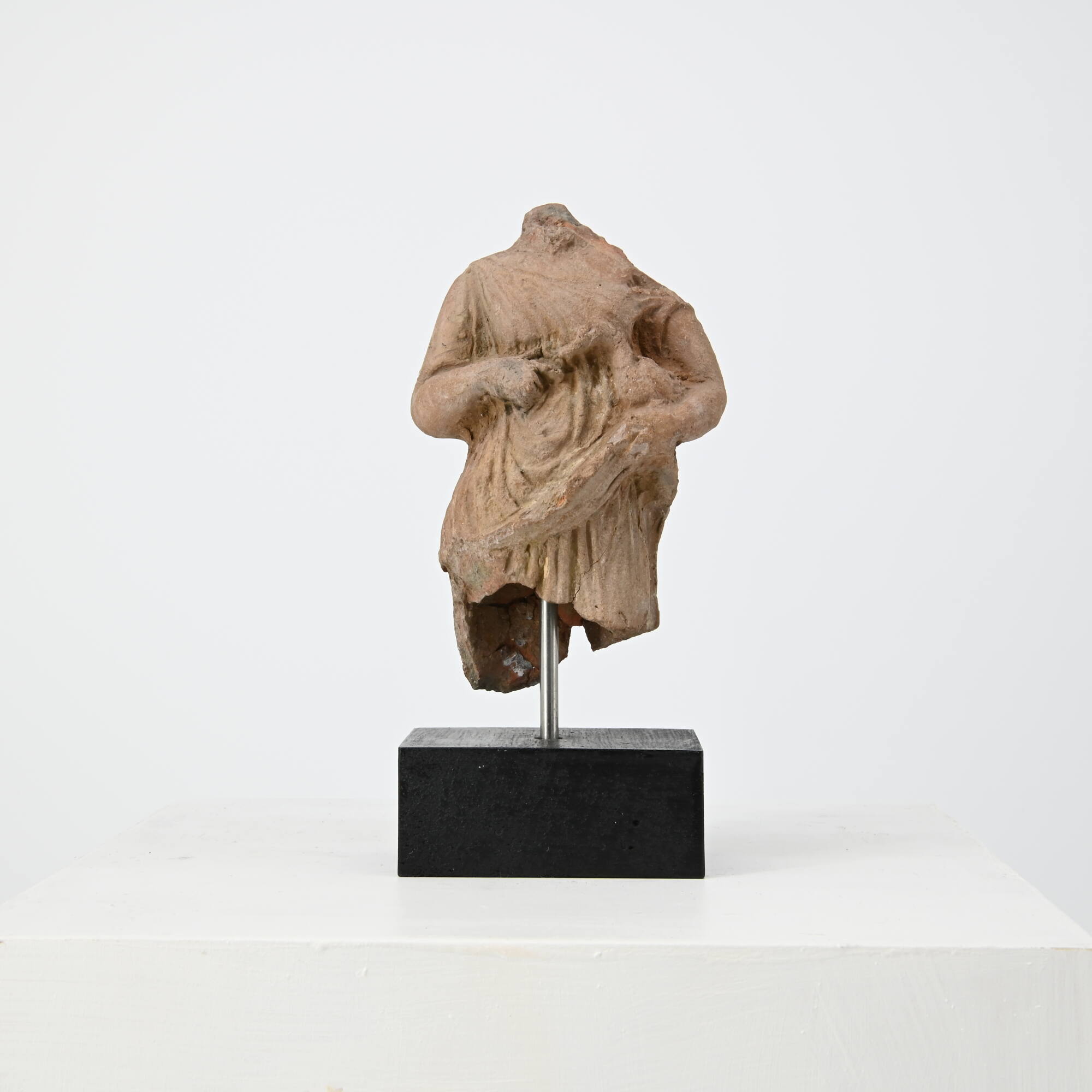 DescriptionFragment eines Mädchens, das eine Gans im linken Arm hält. Das Mädchen ist mit einem ärmellosen und dünnen, unter der Brust gegürteten Chiton bekleidet, der von der linken Schulter auf den Oberarm verrutscht ist. Die Chitonoberfläche ist durch markante und spitzgratige Zerr- und Liegefalten sowie flach mit dem Messer eingetiefte Faltentäler unruhig und ornamental gestaltet. Um den Nabel liegen die Falten kreisförmig an, so dass der Stoff wie nass angeklatscht erscheint. Mit der linken Hand zieht das Mädchen den hüftlangen Überschlag hoch, um darin das Gänschen zu verbergen. Mit dem Zeigefinger der rechten Hand scheint sie den Schnabel des Tieres zu stubsen.DimensionsH 10,6 cm; B 6,7 cm; T 4,2 cm