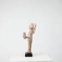 DescriptionMit eng aneinandergepressten Beinen stehende, gänzlich frontal ausgerichtete Tänzerin, die ihre extra angestückten, verhältnismäßig langen und unproportioniert-teigigen Arme seitlich von sich streckt. Mit der erhobenen rechten Hand umgreift sie einen runden Fächer, mit der in Hüfthöhe gehaltenen linken eine Handgirlande. Die Frau ist mit einem ärmellosen Chiton bekleidet, der in regelmäßigen, streng parallelen Falten bis an die Knöchel hinabreicht, der hüftlange Überschlag schwingt seitlich aus. Zwischen den Beinen hängt bis in Kniehöhe ein schmaler, mit Fransen versehener Schal. Um die Brust ist eineKette kreuzweise gelegt, der Schnittpunkt mit einer runden Scheibe verziert. Arm- und Fußgelenke sind mit breiten Reifen geschmückt, der Kopf mit einem üppigen Aufbau. Das Gesicht ist feist und aufgebläht, das Kinn tritt kugelig hervor. Über den lockigen, nach hinten gestrichenen Haaren sitzen ein kleinerer und ein größerer