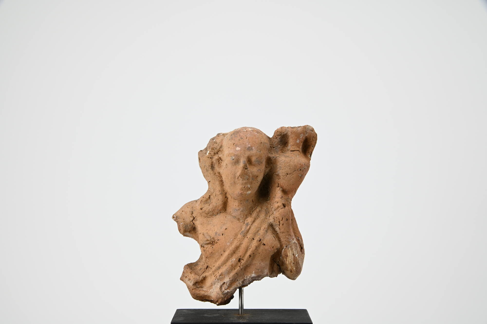 DescriptionFrontal ausgerichteter Mann mit Kahlschädel und Jugendlocke, der links eine kleine Spitzamphora schultert. Der rechte Arm war mit der Hand in die Hüfte gestützt. Ein breites dreifaches Band liegt diagonal vor der Brust. Der Kopftyp entspricht dem altägyptischen Schema: langer Schädel mit hoher Stirn und runder Kalotte.DimensionsH 11,7 cm; B 8,1 cm; T 3,3 cm