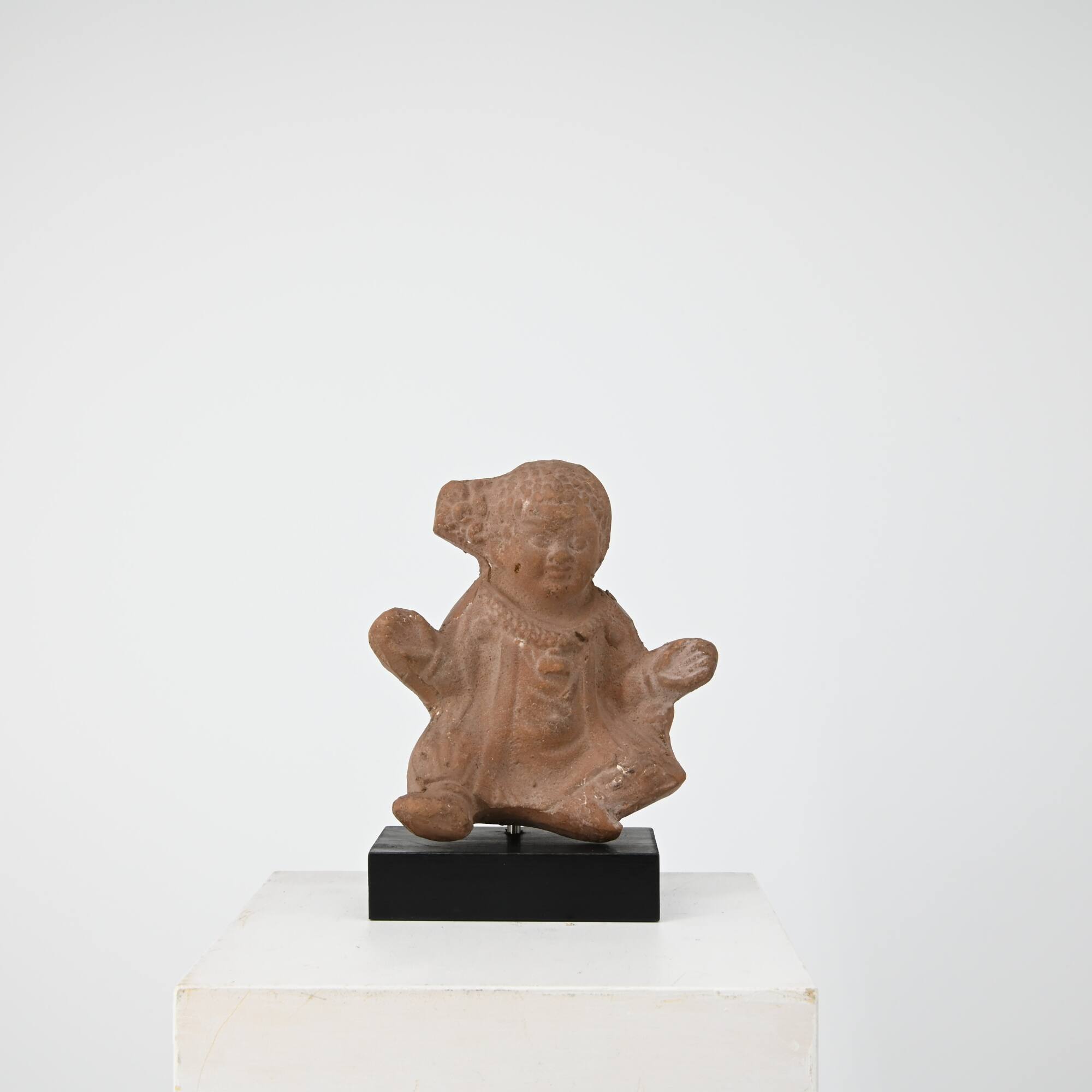 DescriptionMit angewinkelten Beinen kauernder Knabe, beide Arme angewinkelt und mit geöffneten Handflächen seitlich ausgestreckt. Die Finger sind eingeritzt. Das Kleinkind ist mit einem knielangen Gewand bekleidet, das den Bauchnabel durchscheinen läßt, ansonsten mit wenigen Falten gegliedert ist. Am Rücken sind breite durchhängende Falten schematisch eingekerbt. Auf beiden Seiten des Halses hängen lange Streifen, Clavi, bis auf den Saum herab. Um den Hals ist ein schmaler gepunkteter Kranz gelegt, an dem außen je eine Phalera, in der Mitte eine Bulla hängen. Außerdem trägt der Knabe Arm- und Beinringe; am linken Handgelenk baumelt ein kleiner Aryballos. Sein runder Kopf sitzt direkt auf dem Körper, das Gesicht mit vorquellenden Augenscheiben ist aufgeblasen. Der Schädel ist mit eng anliegenden Buckellocken bedeckt, an der rechten Seite bilden sie eine waagrecht abstehende Jugendlocke, die mit einer Bandschleife verziert ist.DimensionsH 10,8 cm; B 8,5 cm; T 4,9 cm