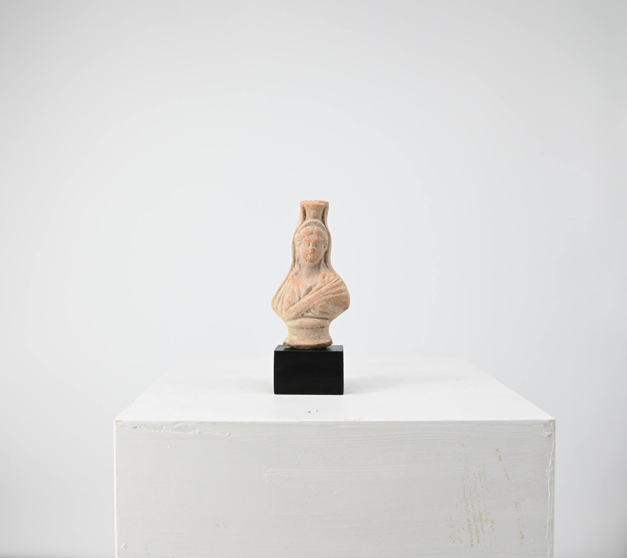 DescriptionPlastischer Henkelaufsatz in Form einer Büste wie Nr. 231; grobere Ausführung aus einer anderen Form ohne Henkelansatz; zylindrischer Sockel mit wulstigem oberen Rand; Büstenstütze hinten nur mit Strichen angedeutet.DimensionsH 7,5 cm; B 4,0 cm;